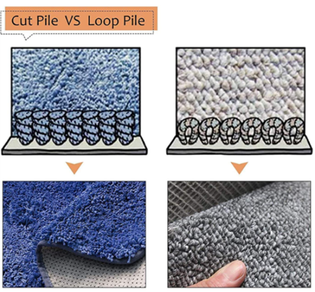 The first step to making carpet is called tufting. This is the process of weaving fibers into a backing material, such as woven polypropylene, with a large machine called a tufting machine. The tufting machine has hundreds to thousands of needles to pull yarn through the backing material, this process may look similar to a blend knitting or crochet and sewing with the needles piercing the backing material and hooks grabbing the fibers to hold the newly made loops in place. These loops are called “loop pile”, cutting the loops creates “cut pile” construction. A computer will direct the tufting machine which loops to cut (if any) and at what height to create different textures and patterns within the carpet, creating many options for customers to choose from.